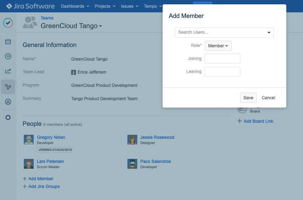 When you add members to a Tempo team, you can assign a role to each member, as well as the dates they joined or left the team.