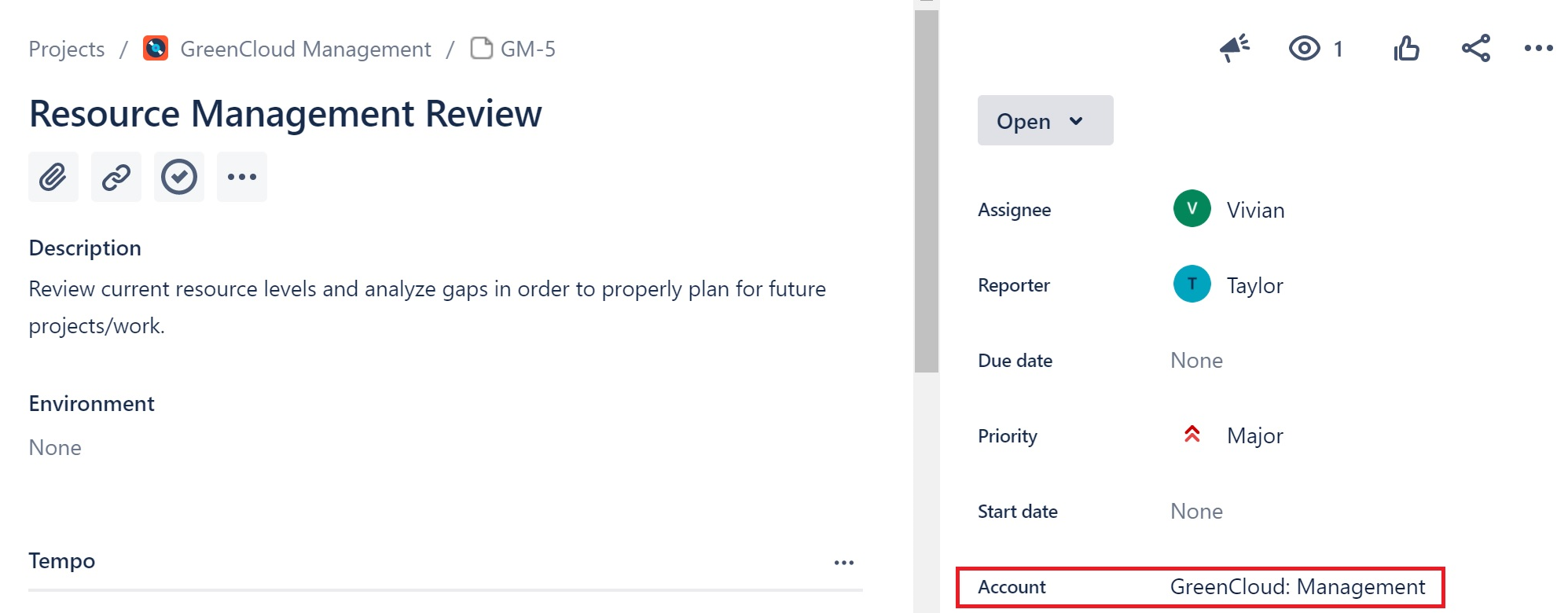 Once that is done, choose the value for the account and the field will appear in the issue view. Please note, if no value is set for the Account Custom Field, it will not appear in the issue view (on Server and Data Center you will need to edit it through the Edit Issue Screen).