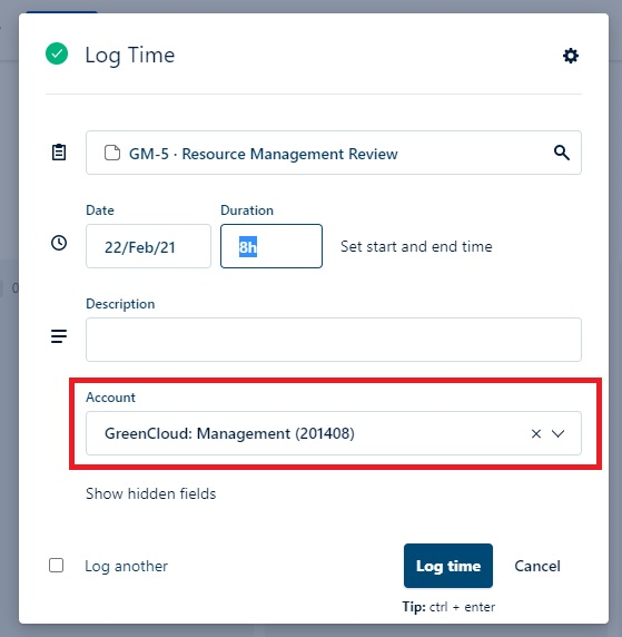 Different from the Account Custom Field, the Account Work Attribute is not configured in the issue screen, but in the Tempo Settings and will appear in the log time form. The value for the account is chosen when logging time. Each time the users log their time, they will need to choose the account value from a dropdown. The dropdown will present all the accounts linked to that project and the global accounts you may have.