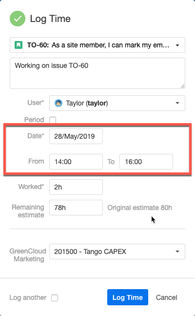 Users can specify a start time when they log time | Not selected | When this option is selected, a Time box is added to the Log Time dialog box that users fill out every time they log time. Users can specify a start time for their logged time in this box. If this option in not selected but users want to specify a start time for their worklogs, they must log time in the Time view of the My Work Calendar. See also Time difference between JIRA worklogs and Tempo worklogs. |
