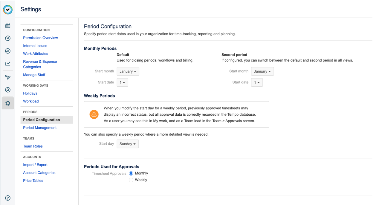 Tempo Administrators can configure the reporting period used for tracking time and reporting on work done in your organization.