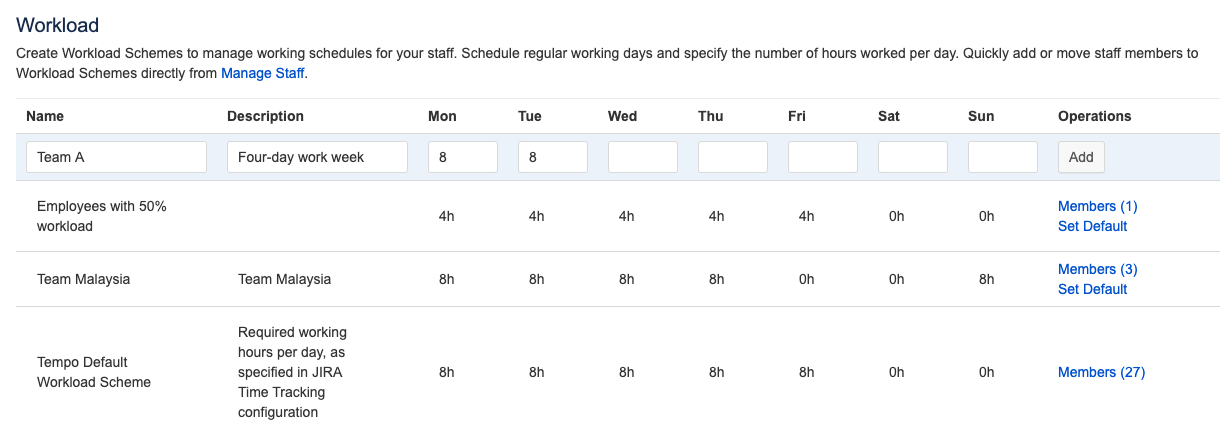 Workload schemes define the working schedule for your staff. Create or edit workload schemes to manage different types of users' workload. The required hours per day calculation is based on a user's workload scheme. You must assign all staff members to a Tempo workload scheme. New staff is automatically added to the default workload scheme.