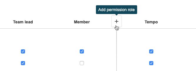 (For Tempo Timesheets versions prior to 10.16, click the settings icon :settings_dc: at the top-right, and then click Permissions.)To add a new permission role, click the + Add Permission role link. If the Add permissions role column is not visible, click the + sign in the header row.