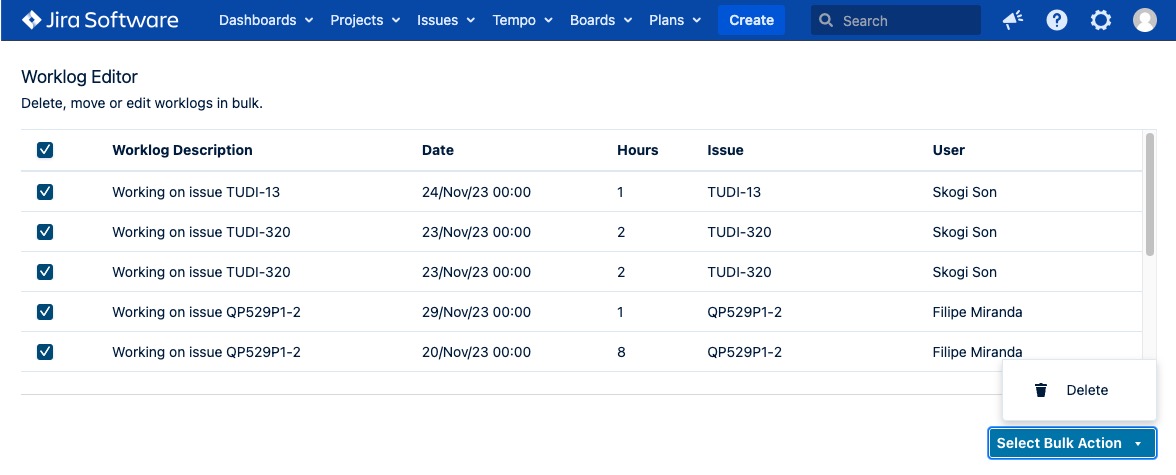 Select up to 1000 worklogs to delete. By default, all the worklogs are selected.