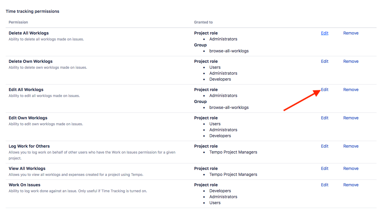 The Edit All Worklogs permission gives users the ability to edit all worklogs made on issues. The permission is a part of a permission scheme that is assigned to the project. For more information about how to manage project permissions, see Managing Project Permissions.