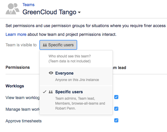 View team worklogs | Permission to view all worklogs for all team members of the selected team. This permission grants access to team members' worklogs, issue summaries, and issue keys - even if these are restricted by your issue security scheme. |