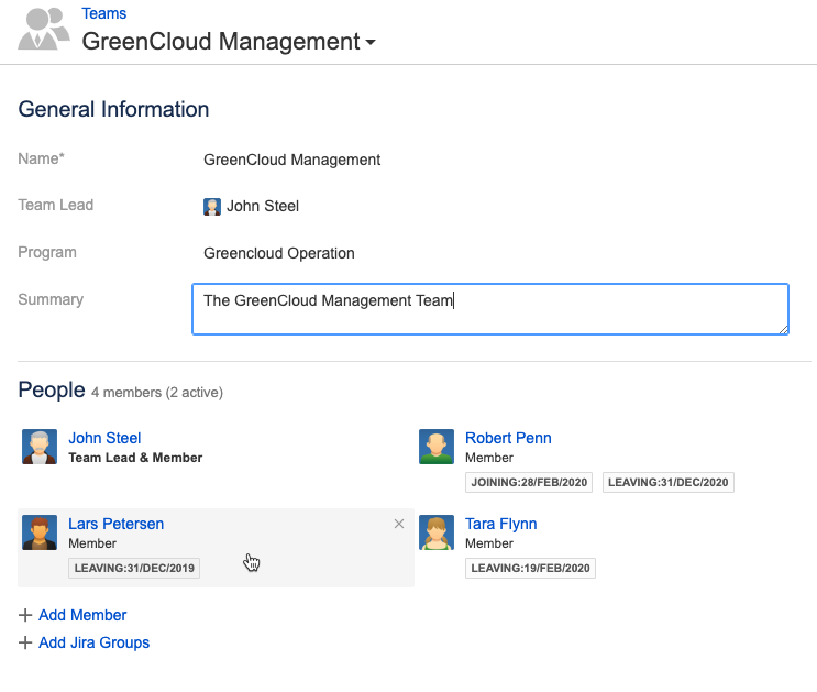 You can edit the basic information about a team: team name, summary description, team lead, and the program (or group of teams) to which the team belongs, and the team's mission. You can also configure team membership by, for example, giving a team member different roles for different time periods, or changing the amount of time that a team member dedicates to the team.