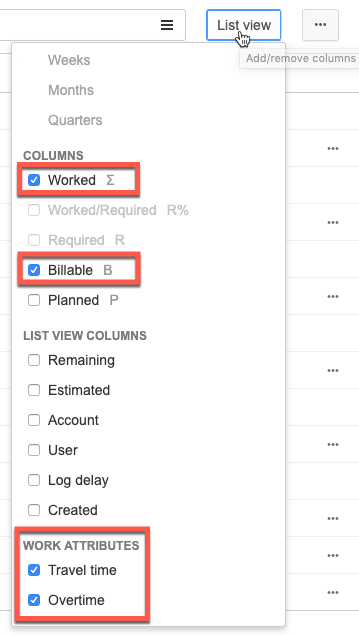 On the List view menu, select the work attributes, Billable, or Worked, depending on what you want to display in the timesheet.