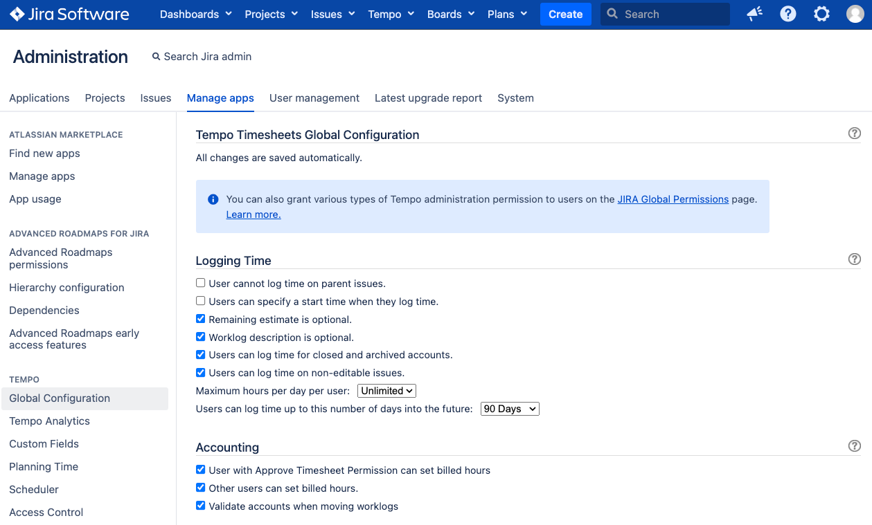 The Tempo Timesheets global configuration settings define how users log time and who can set billable hours. To change the global configuration settings, you need the Jira Administratorpermission.