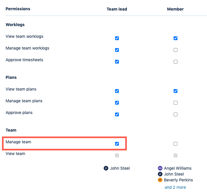 Note that a user with Manage team worklogs might have the same permissions to members in the current team as well as any other teams that the same members actively belong to, and regardless if the user has different team worklog permissions in other teams. The worklog permission checks are validated between users as opposed to teams.