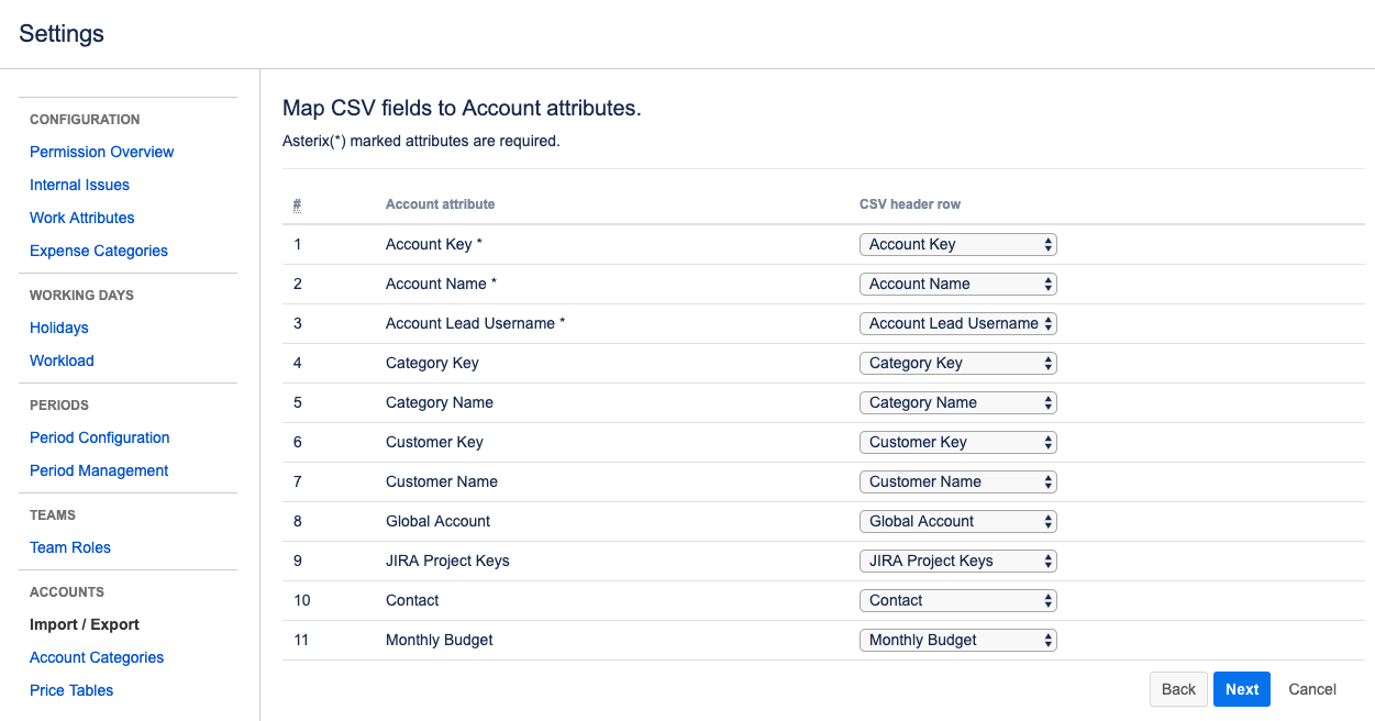 Importing and exporting data to accounts requires the Tempo Account Administrator permission.