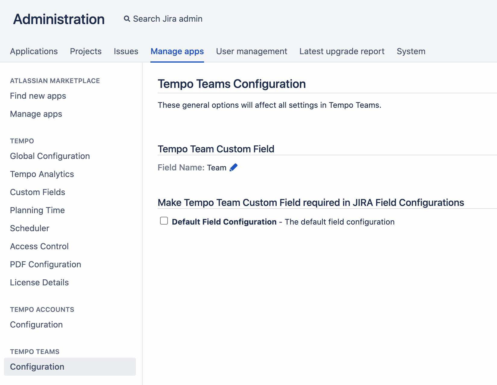 Under Make Tempo Team Custom Field required in Jira Field Configuration, select the Field Configuration check-box