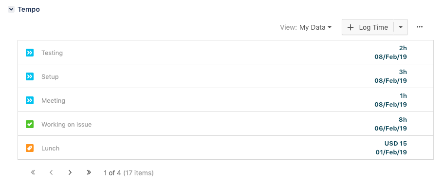 The Tempo panel is displayed in the Jira issue view. Worklogs, plans, and expenses are ordered by date and are color-coded so you can easily identify them. You can quickly filter the data you view in the Tempo panel to display only worklogs, plans, or expenses, and choose whether to display all issue data, or only your own. By default, all types are displayed.