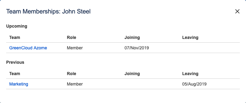 In this example John Steel is currently not a member of any team. Clicking the Team Membership column for him shows that until August 5, 2019 John was working with the Marketing team and he will be joining the GreenCloud Azome team on November 7, 2019.
