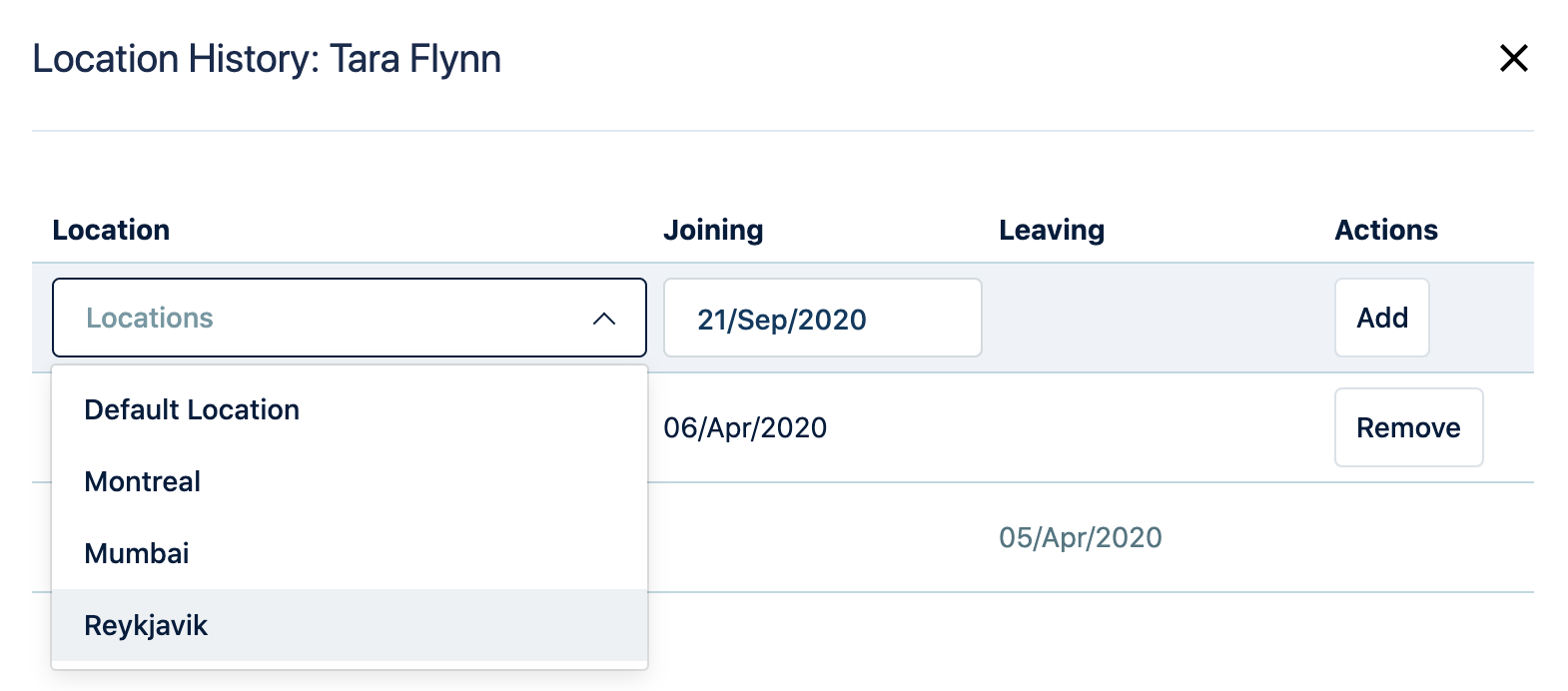 In the Location column of the Manage Staff list you can view the location history of your staff members. The column shows a member's current location, but you can click the column to view their previous and future locations. From there you can also move them to a new location.