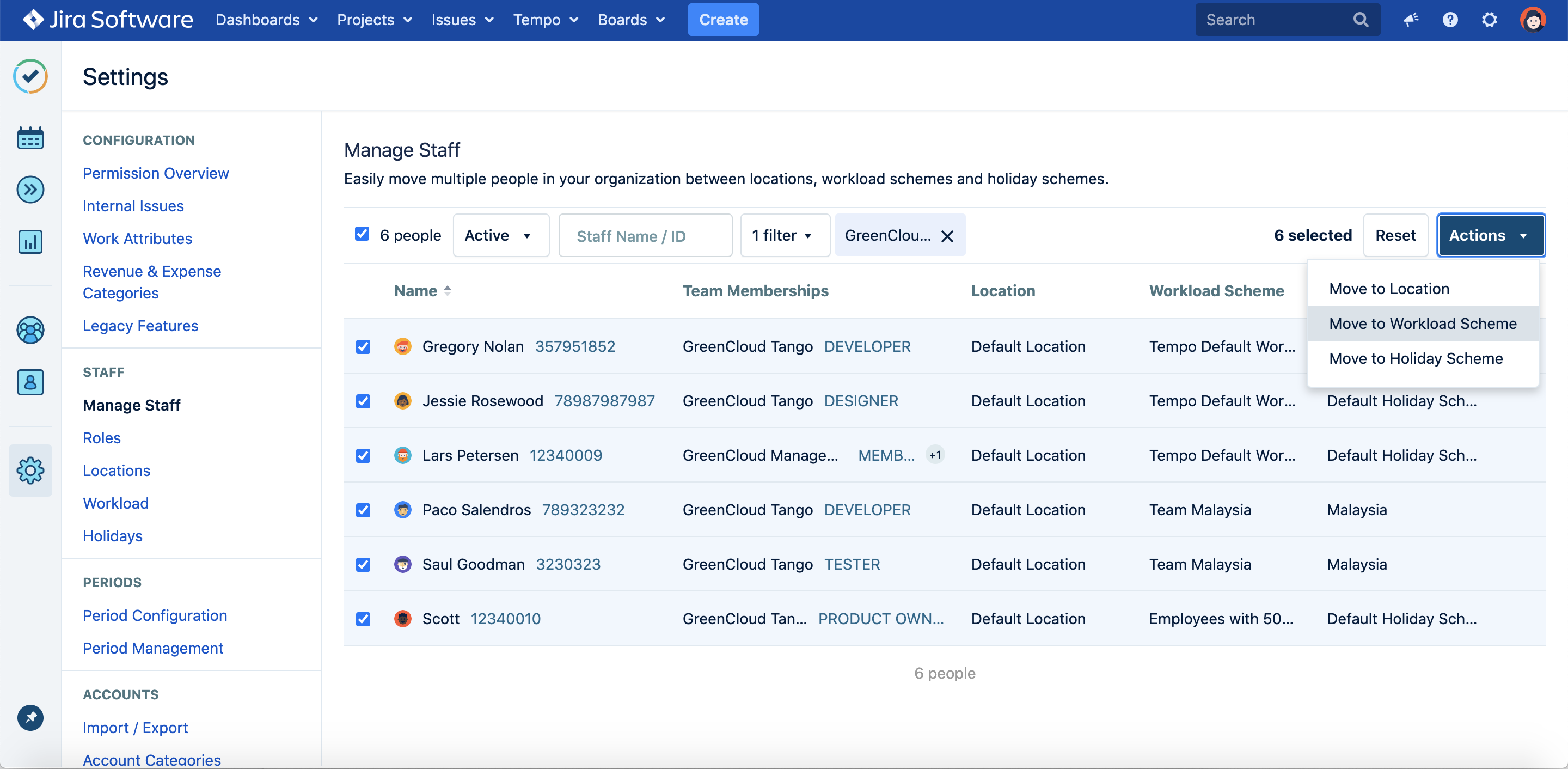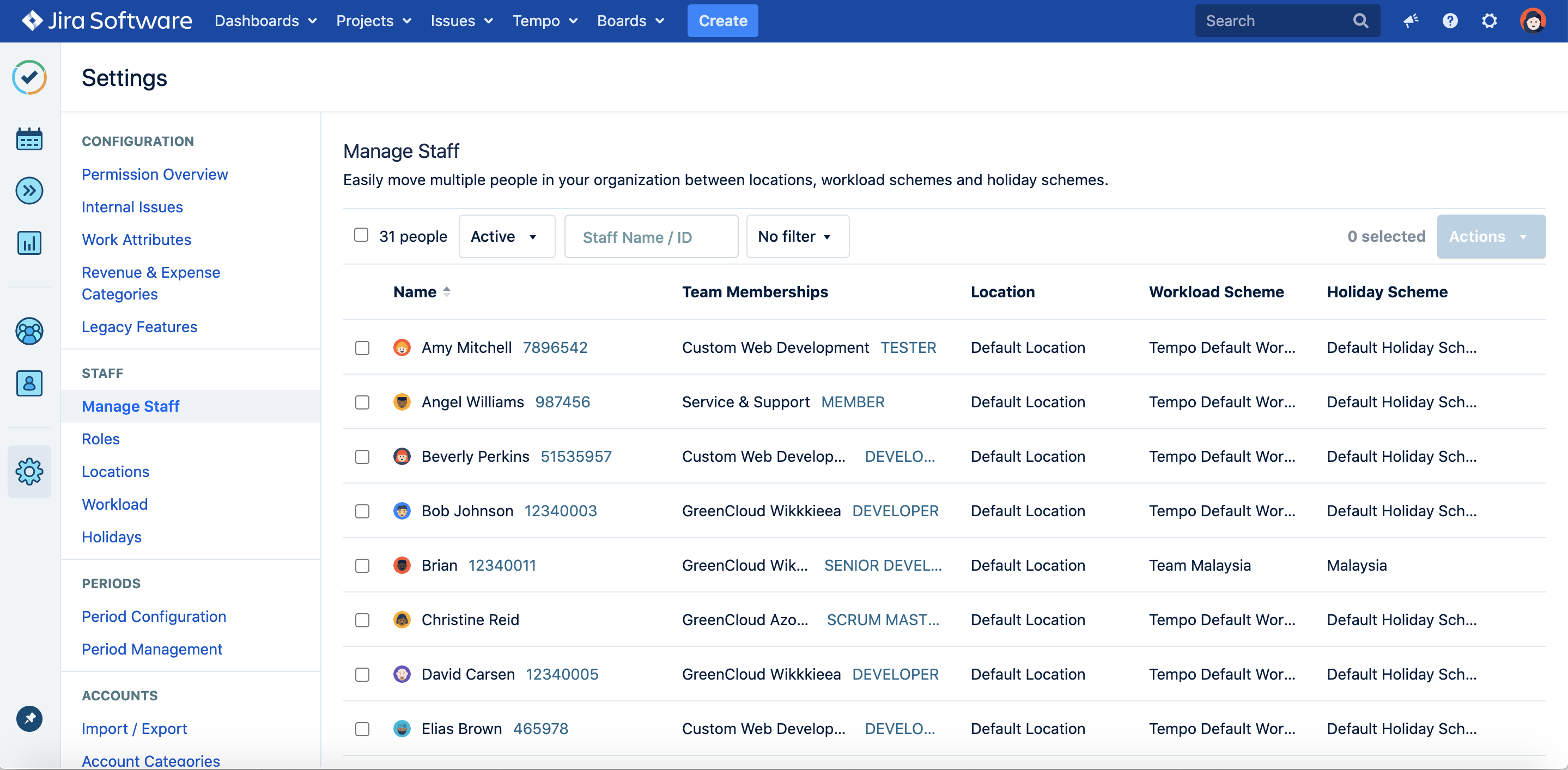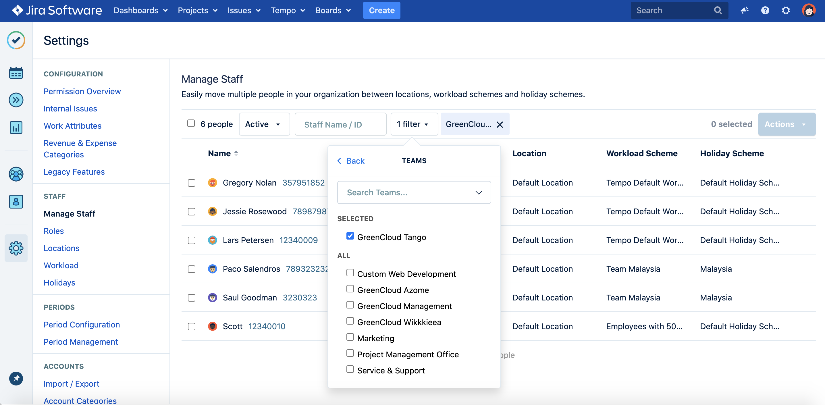 Managing staff requires the Tempo Administrator or Tempo Team Administrator permission.