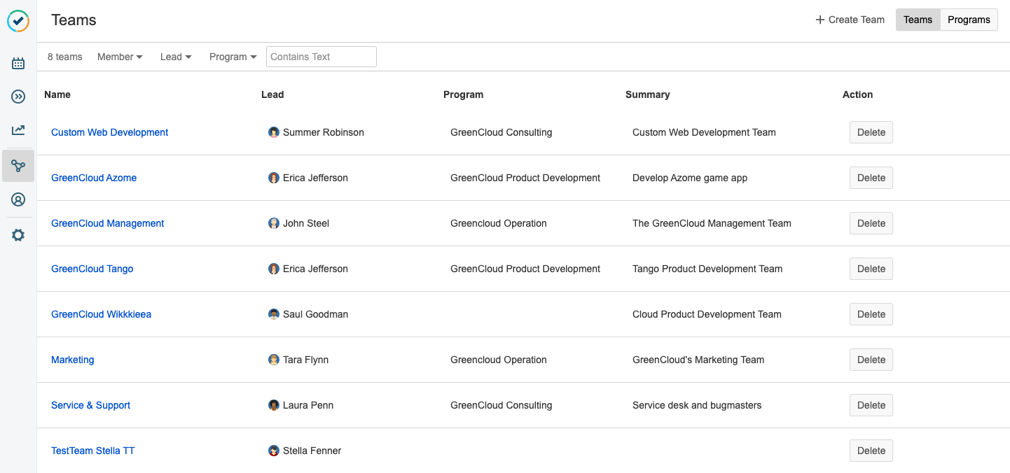 Programs are groups of teams, and are helpful for organizing many smaller teams at once. Each team can only be assigned to a single program, but a program can contain more than one team. Each program can be assigned a Program Manager.