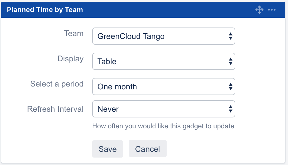 The Planned Time by Team gadget shows planned and unplanned time in the future for a given team. This gadget is great for Team Leads and Executives to track overall planned time from a current date.