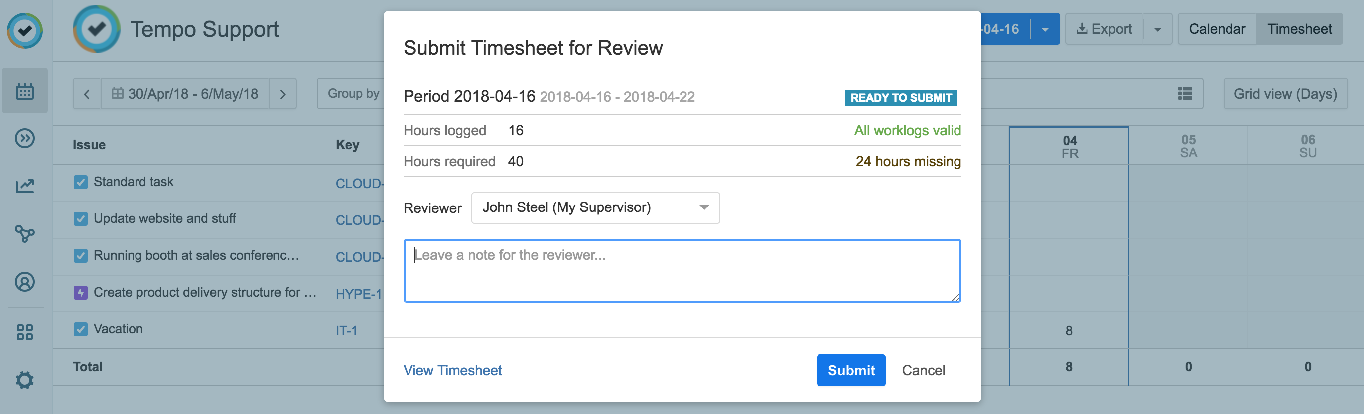 At the end of a period, when you have completed the required workload and logged time, you can submit your timesheet to a reviewer, typically the Team Lead. When a period finishes, the period status changes to Ready to Submit. Selecting a reviewer for a timesheet will automatically send an email to the reviewer asking them to approve or reject the timesheet.