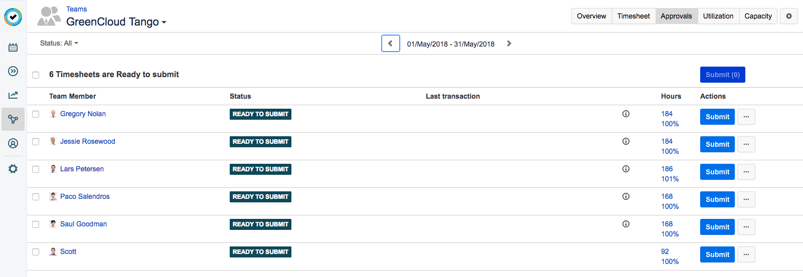 To submit timesheets for multiple team members, select the team members that you want to submit timesheets for, and then click Submit at top.