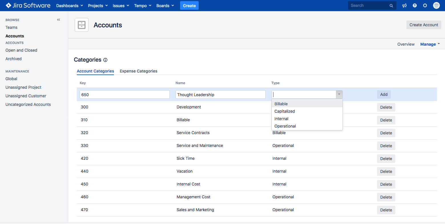 To create an account category in Tempo for Server, you need Tempo Account Administrator permissions: