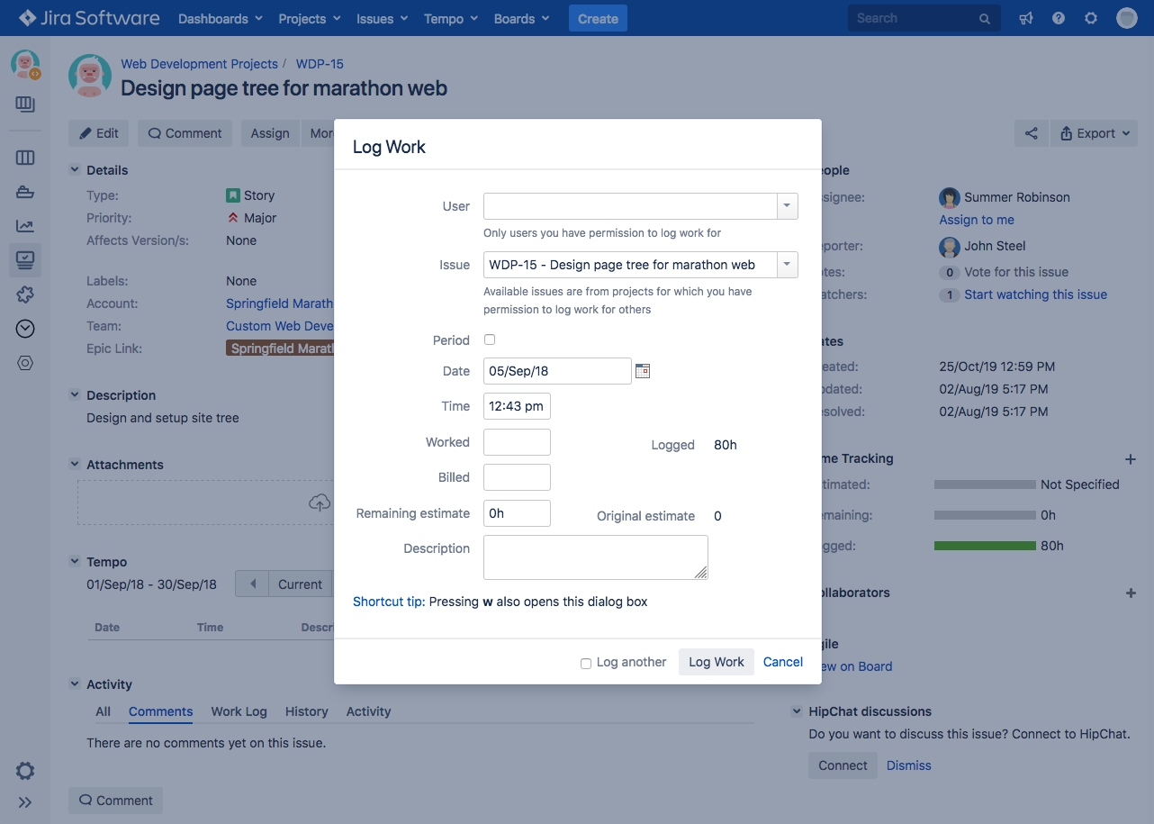 - Click Log Work to create the worklog.