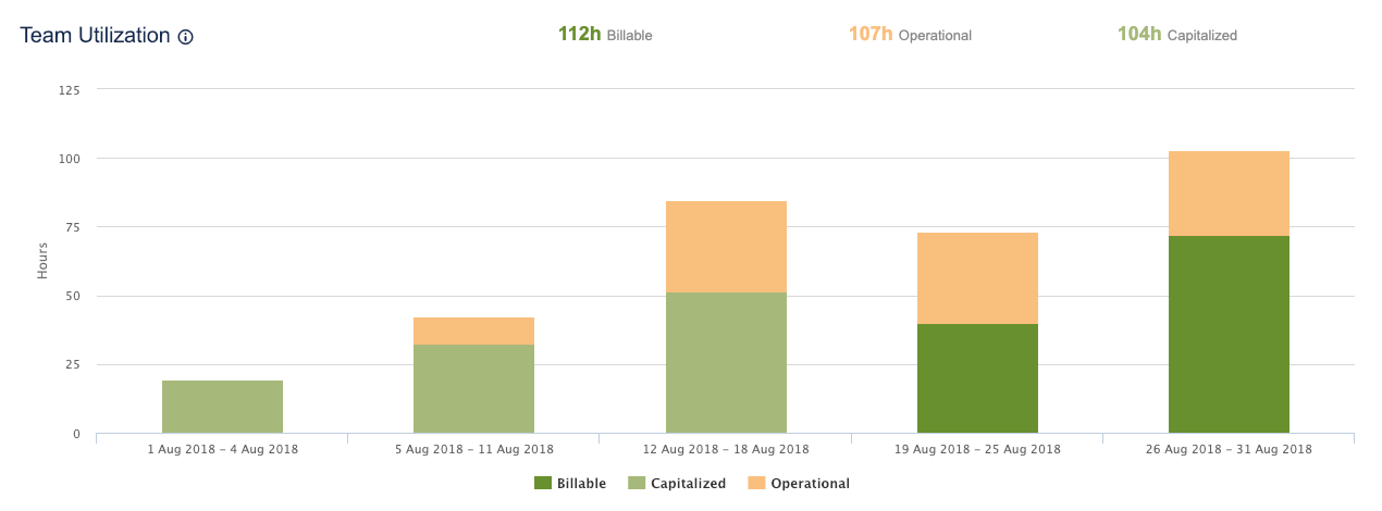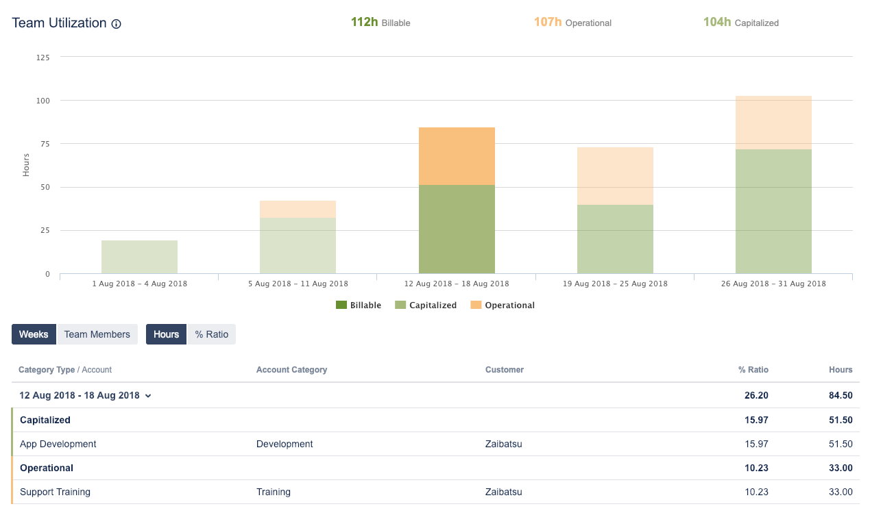 For each team, you can view a Team Utilization report, which consists of a bar chart and table that show the number of logged hours by account type (billable, capitalized, internal, operational). Users with the View Team Worklogs permission can view logged hours of each team member whereas users with the Member role only see their own logged hours. No report is displayed for periods where the team has logged no hours.