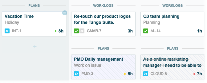 Plans are labelled with :plan_icon: and worklogs with :worklog_icon: . When you have logged time against plans, the plan icon turns gray :plan_icon_gray: to indicate the worklog's origin.