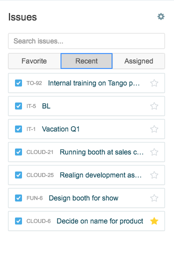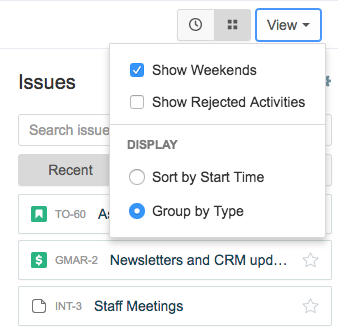 The Issues side panel is displayed on the right side of the My Work Calendar showing Jira issues from predefined JQL searches. You can drag issues from the side panel directly onto the Calendar. The Log Time dialog box opens and you can enter the time worked. To expand the side panel, click