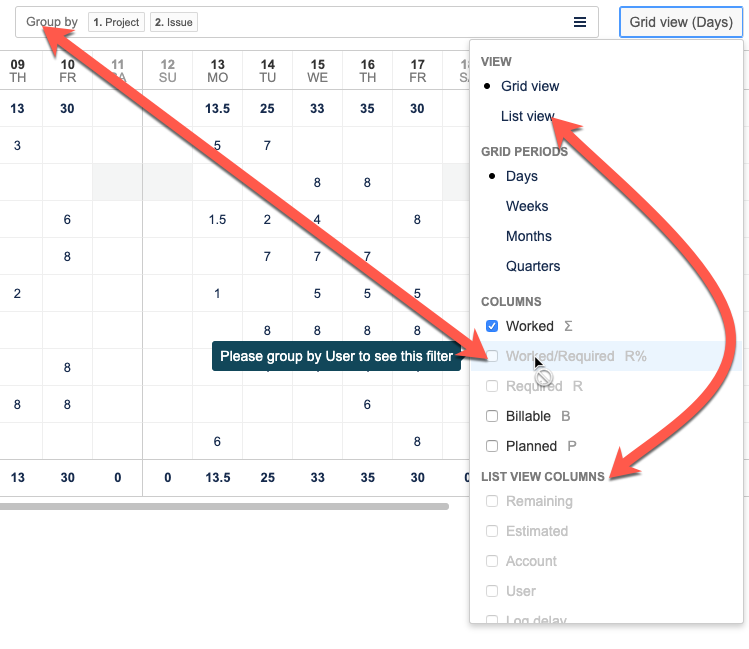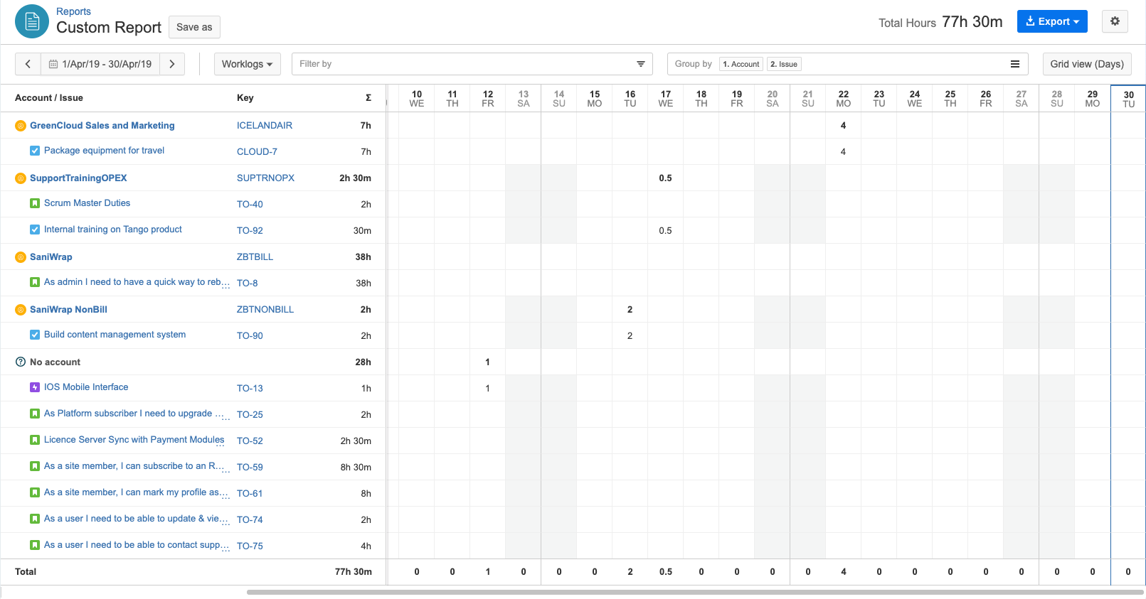 You can customize your reports to show what you need in a meaningful manner. By default, report results are displayed in a grid format, but you can also view the data as a detailed list. You can apply filters, organize the information into groups, sort the data by columns, set report preferences, and add columns to show Jira fields and work attributes as needed. When viewing reports as a grid, you can also define whether the grids represent days, weeks, months, or quarters.