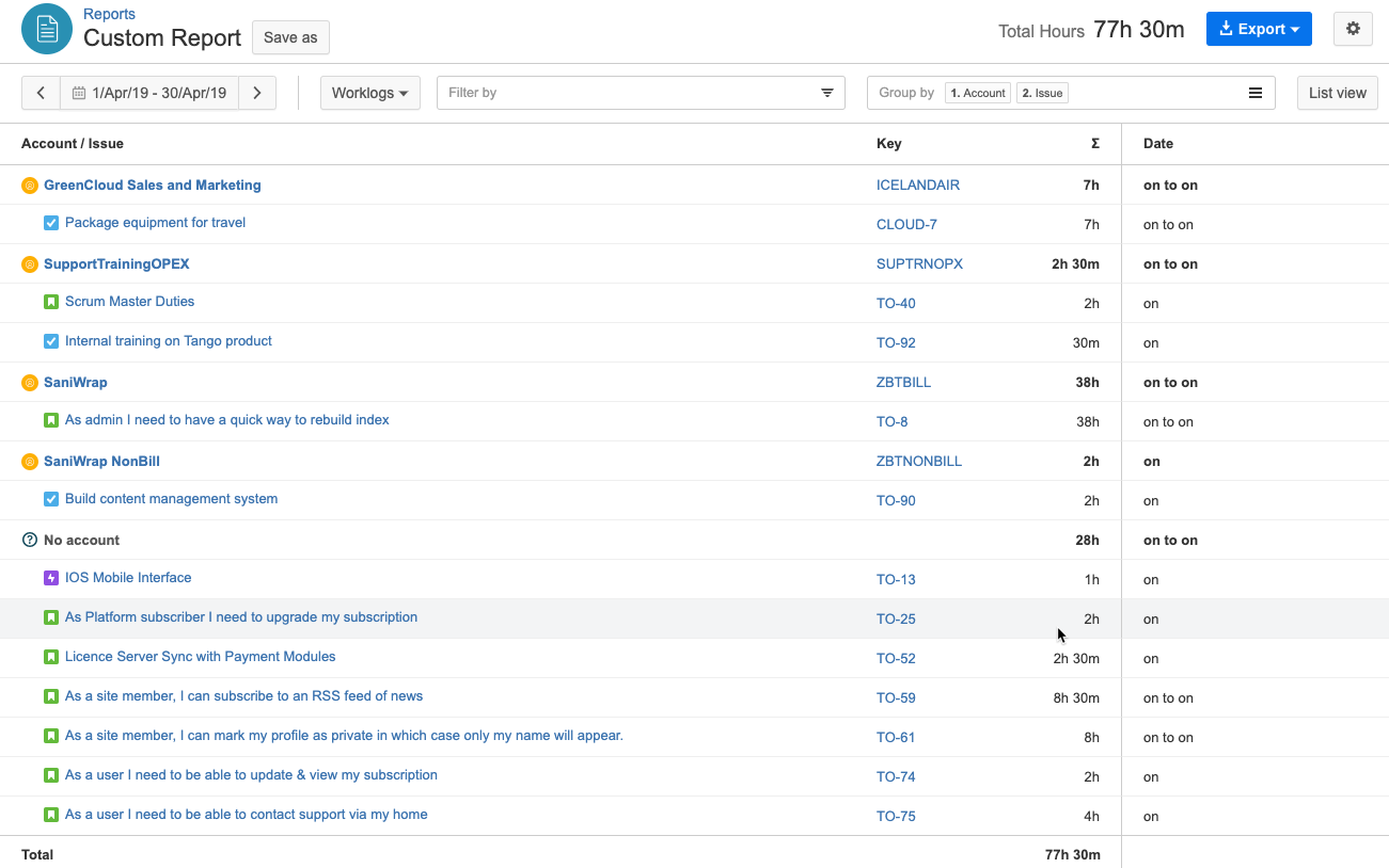 Adding and removing columns lets you select what information is displayed in your report. For example, if you want to view how many billable vs. non-billable hours were spent on issues linked to an account, filter the report by Customer and group the information by Account. Then, add the Billable column to compare billable and logged hours.