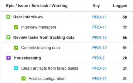 To simplify the report view, reports containing multiple levels of grouping do not display "empty" hierarchy levels. The following example shows a report that has been grouped by Epic/Issue/Sub-task/Worklog. No Epic hierarchy level is shown for Issue PRO-11 since it is not linked to an epic. Also, there is no hierarchy level for Sub-tasks because the issues do not have any. This makes the report look tidier and more easy to read.