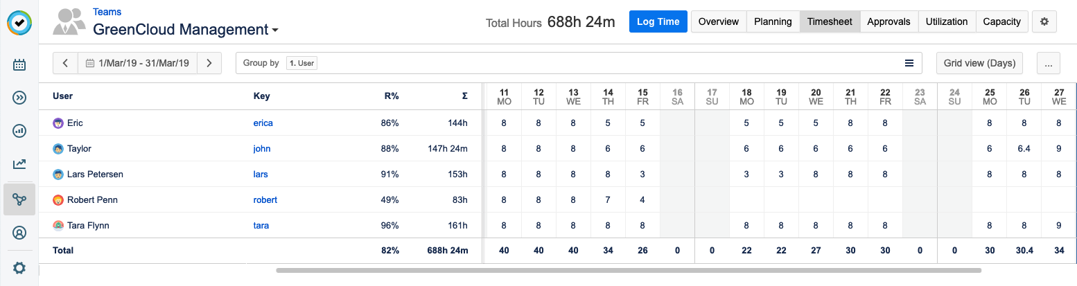 The team timesheet provides team leads and project managers with a quick overview of the time that is logged by team members on different projects. In the team timesheet, team leads and other users with the Approve Timesheets permission can approve timesheets for team members.