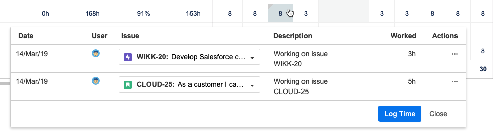 To see the hours broken down to their issues, click the relevant cell. In the pop-up, you can also edit the worklogs.
