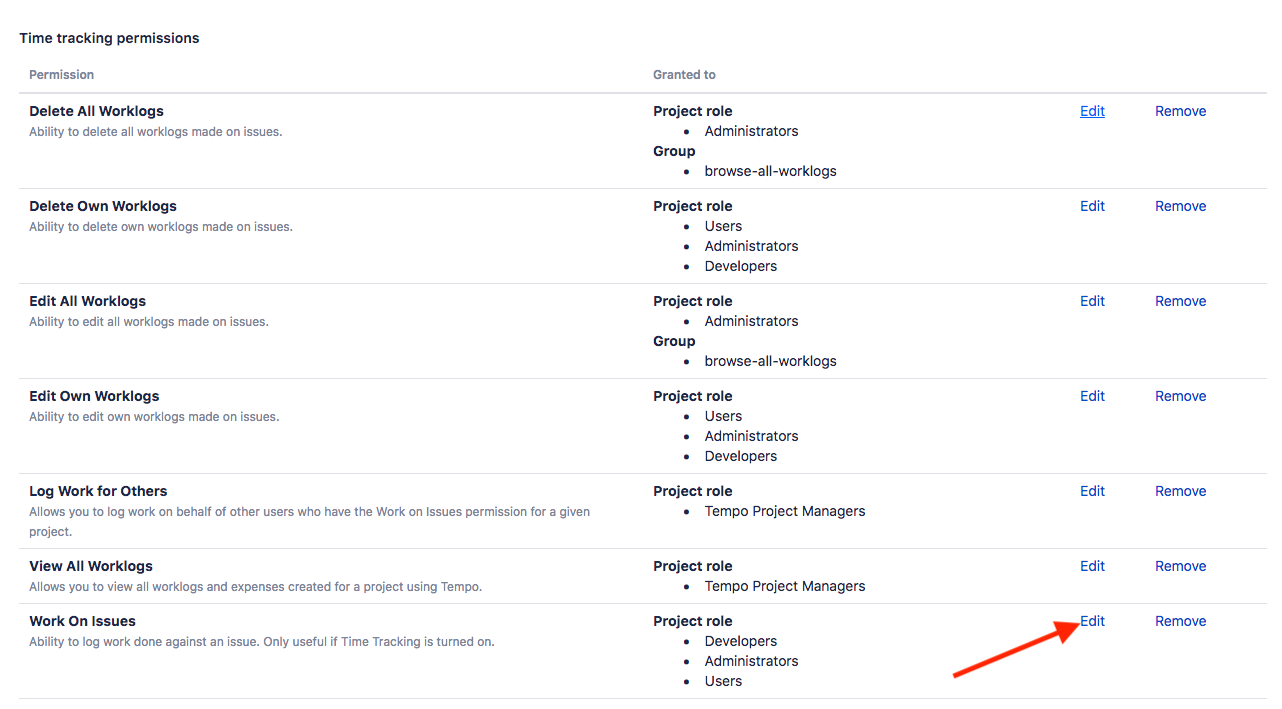 Go to Time tracking permissions. Find Work On Issues and click the Edit link.