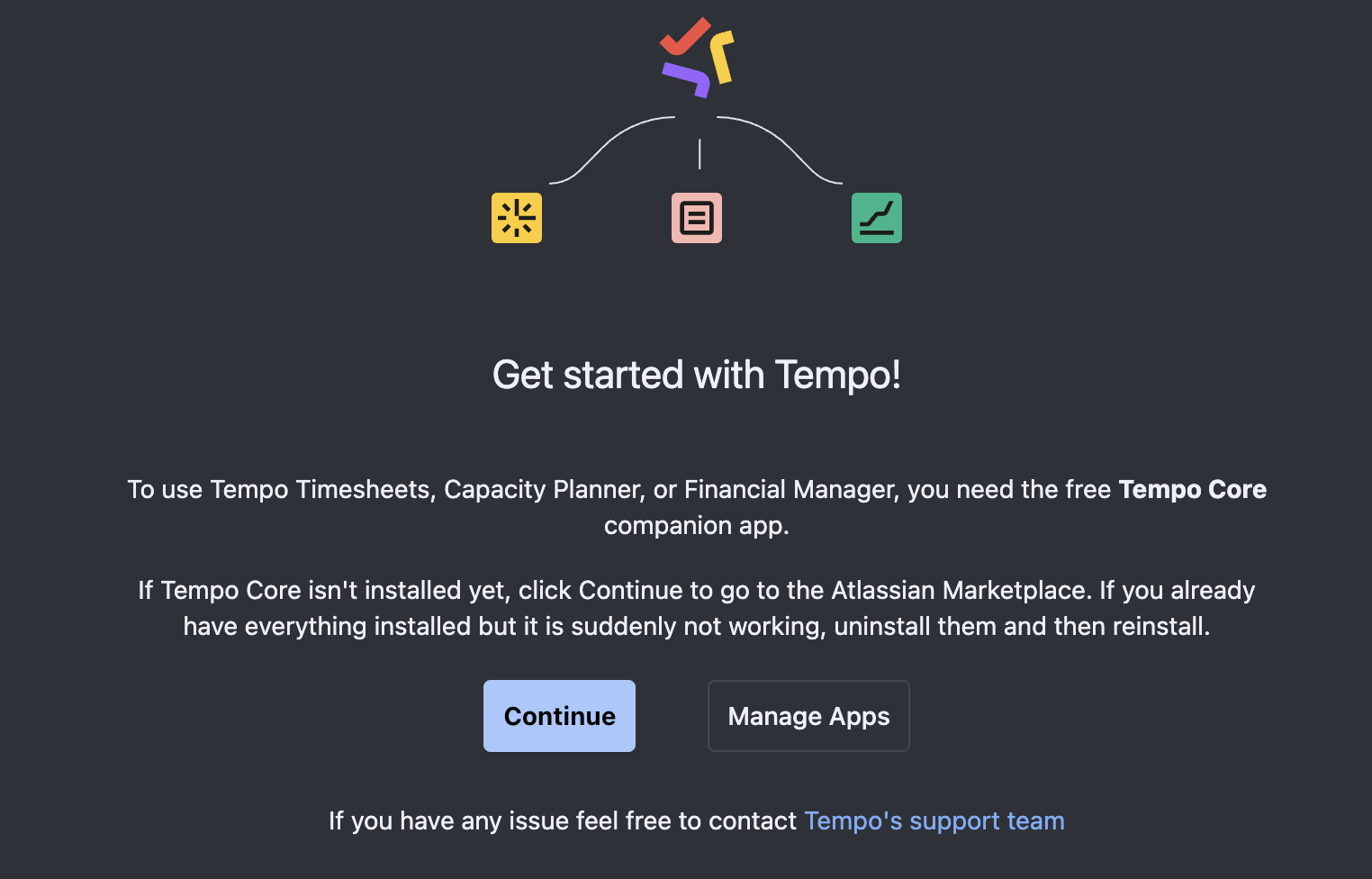 Click Continue to proceed to the Atlassian Marketplace and install Tempo Core.