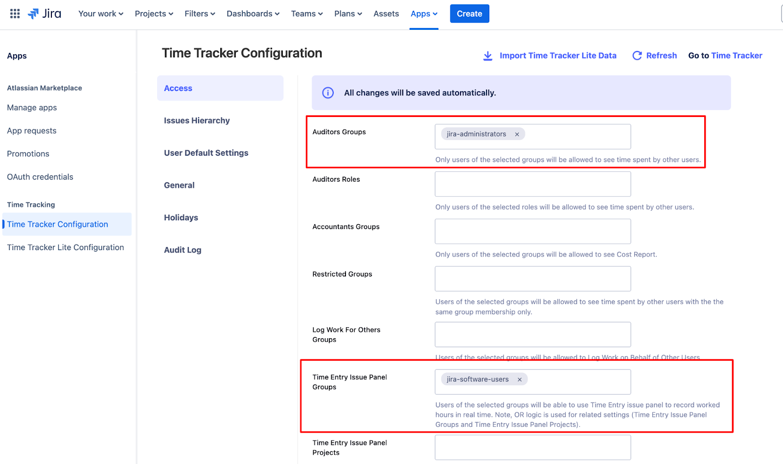 Note: Use the Auditors Groups if your users can view the workloads from other users, and use the Time Entry Issue Panel Groups if your users can only view their workloads.