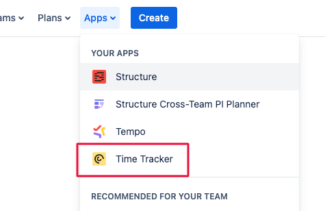 After you install Time Tracker, you can access the app using Jira Cloud’s main navigation bar, regardless of your user permissions. Select Apps>Time Tracker.