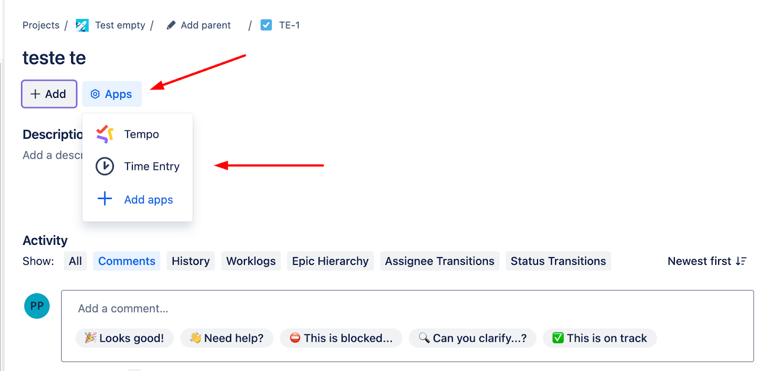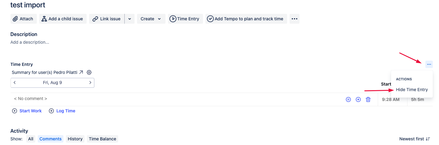 Each user who needs to log time or view the Time Entry panel can select the Time Entry button on the Issue view. After the button is selected, the panel will save and remain visible for that specific issue for all users.