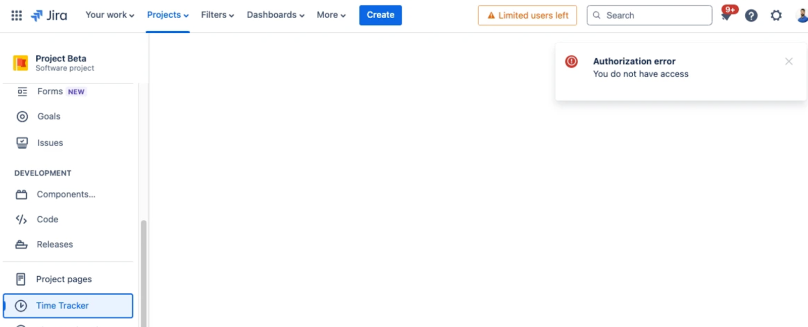 The same error message will display when accessing the Time Tracker on the project page.